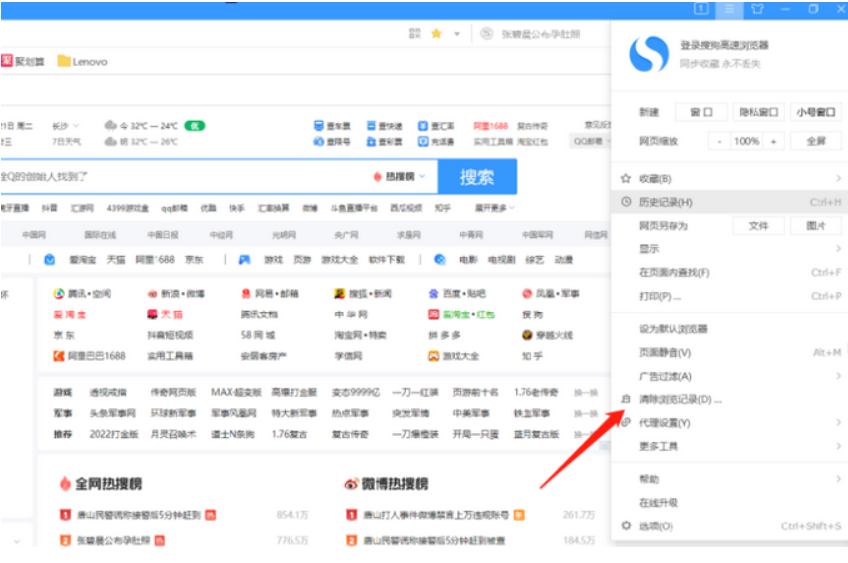 3、在弹出列表中选择“清除浏览记录”。搜狗浏览器怎么清除缓存