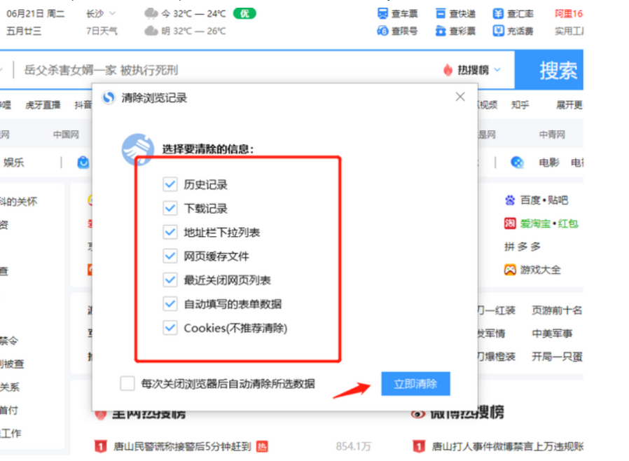 4、然后按图所示勾选所有选项,点击“立即清除”,等待一段时间即可彻底将搜狗浏览器缓存清除。