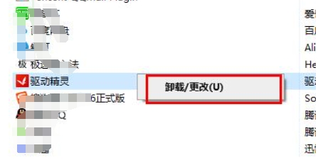 4、在卸载任务栏中找到“驱动精灵”,右击选择“卸载”。