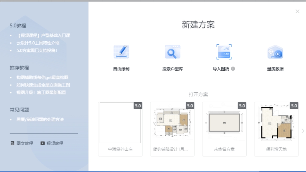 2、进入设计工具界面,在弹出窗口中有四种新建方案的方式可供选择(可根据您实际需要进行选择)。