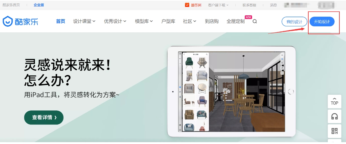 1、进入酷家乐软件页面,点击开始设计。