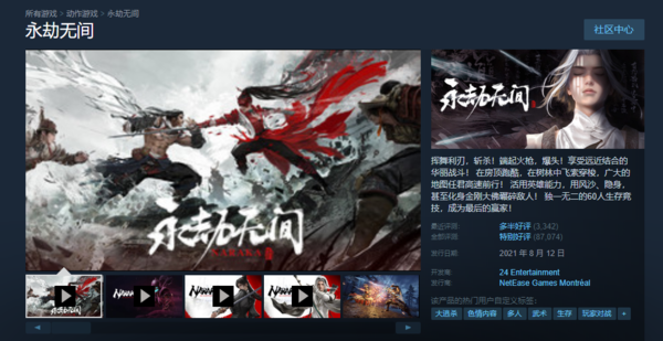 永劫无间是网易旗下的“24?Entertainment工作室”开发的一款多人动作竞技战术策略游戏,于2021年7月8日上线测试,Steam上面向全球的公测在2021年8月12日10点正式开服测试。