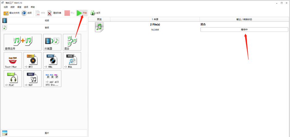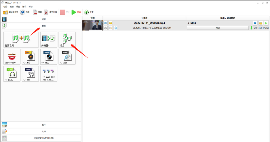 1.首先我们需要将格式工厂打开进入到页面中,在页面的左侧点击一下【音频】按钮,之后在【音频】下有一些功能选项,这里选择【混合】。