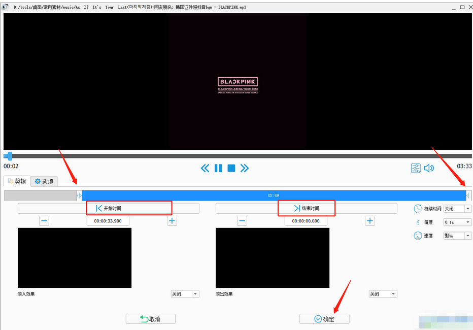 5.在打开的页面中你可以用鼠标拉动时间轴进行裁剪开始时间和结束时间,并且还可以设置一下淡出和淡入效果,之后点击确定即可。