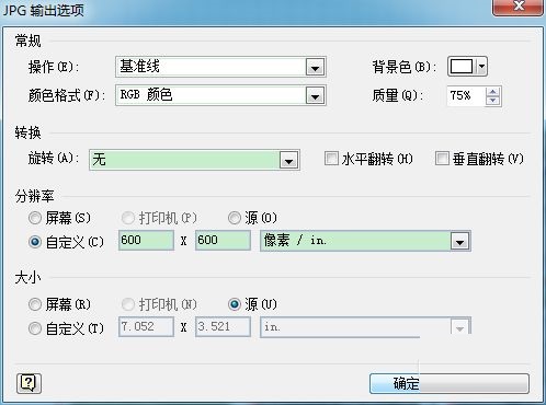 第三步:此时弹出JPG输出选项,对分辨率自定义为 600,600,点击确定(如图所示)。