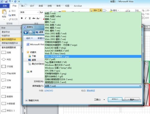 第二步:点击visio 左上角 “文件”-> “另存为”->“保存类型”->“JPEG文件交换格式”->输入图片名字->点击保存,记得存在要求的位置(如图所示)。