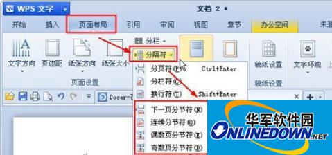 在“页面布局”中找到“分隔符”,点击▽可以看到四种分节符,下一页分节符表示在分节的同时进行分页,连续分节符表示在同一页进行分节,也就是说一页中都可以有多节,奇偶数分节符一般在对双面打印的文档进行排版的时候会用到;用来保证某些页面始终在装订好的文档翻开后在左边或右边。因为书本的章节的起始页很多都要求固定在奇数页。