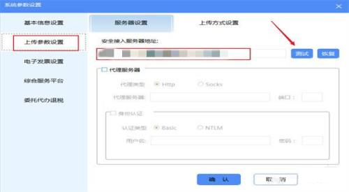 第二步:打开系统参数设置页面,在左侧列表选择上传参数设置。在右侧窗口选择服务器设置,在地址栏输入服务器地址,点击测试按钮。