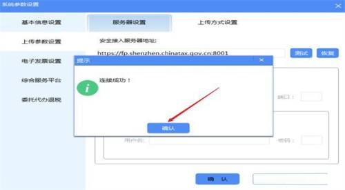 第三步:系统弹出窗口提示连接成功,说明上传参数已经设置成功,点击确认即可。