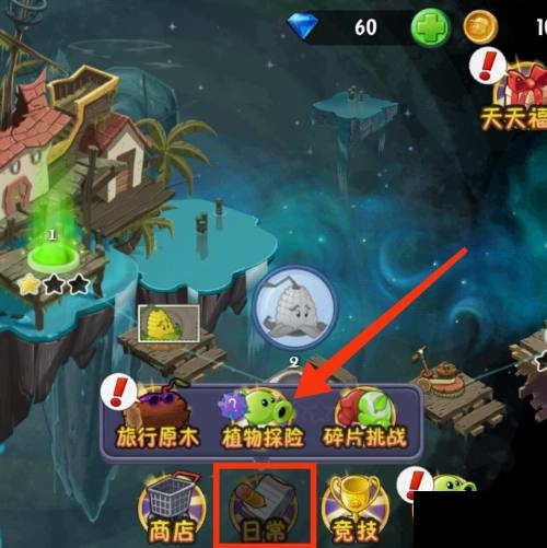 第一步:首先我们打开植物大战僵尸APP,选择页面右下角的日常,点击植物探险(如图所示)。