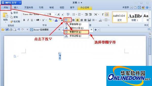 在“开始”菜单中找到如下图标,点击▽,选择“带圈字符”项,如下图所示:
