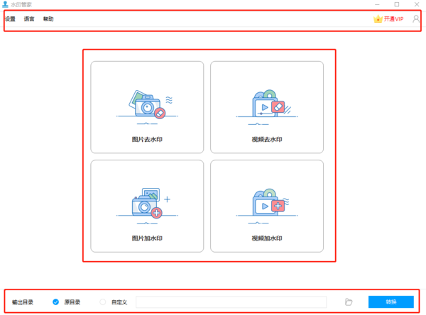 这款软件采用了上方工具栏,中间主菜单加下方输出路径的格局,这比较符合大多数用户喜欢“自上至下”阅览的模式,在水印管家中,我们可以先在上方调整设置,之后在中间选择菜单功能,接着在下面确定输出目录,最后转换,整个流程不仅简单,也符合我们的使用习惯,非常不错。
