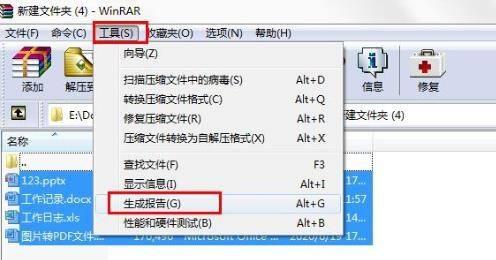 接着,点击WinRAR压缩软件的【工具】菜单,在下拉菜单中选择【生成报告】