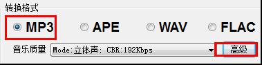 转换格式里,选择MP,点击音乐质量最右侧的高级,进入配置页面。