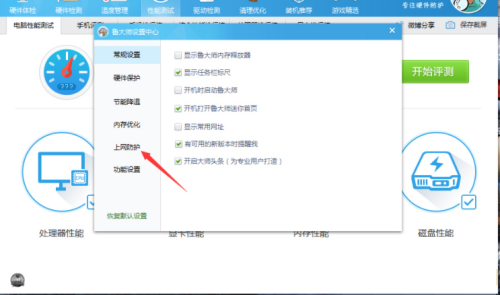 第二步:在鲁大师设置中心新窗口左侧边栏找到“上网防护”选项,并将之打开。