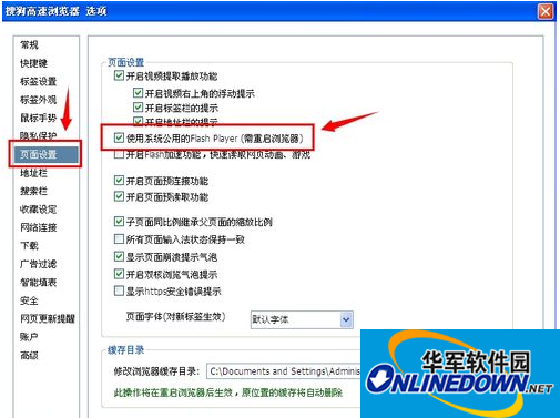 2.再选择“页面设置”,在右边勾选“使用系统公用的Flash Player”,再重新启动浏览器。