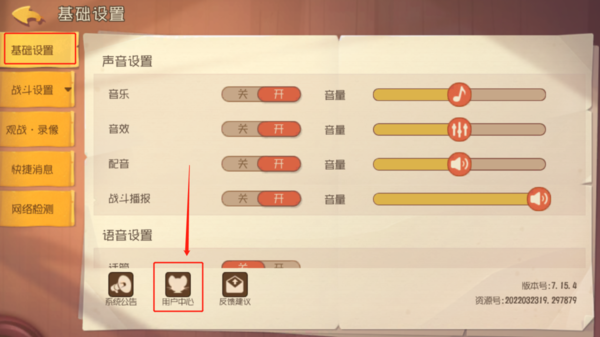 在猫和老鼠手游电脑版游戏主页面,点击右上角的设置图标,调换到基础设置页面后,点击下方的“用户中心”选项。