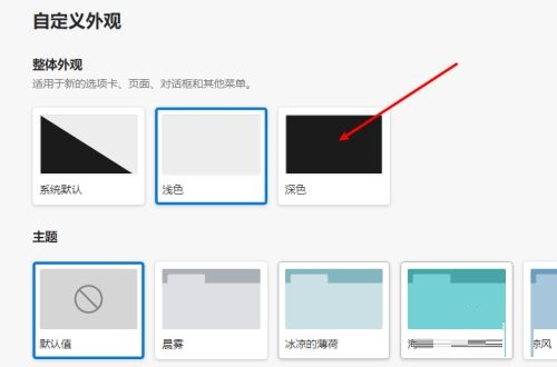 第四步:在整体外观下点击深色后浏览器整体外观设置为深色了(如图所示)。