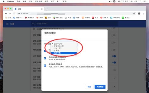 第九步:可以点击时间,选择其他清理时间范围,例如这里演示选择“时间不限”也就是清除所有的Cookie(如图所示)。