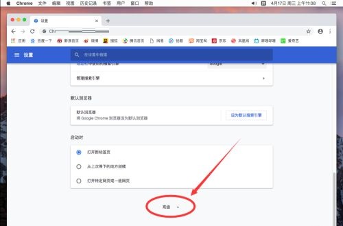 第六步:进入谷歌浏览器偏好设置后,向下滚动页面,找到“高级”,点击打开(如图所示)。