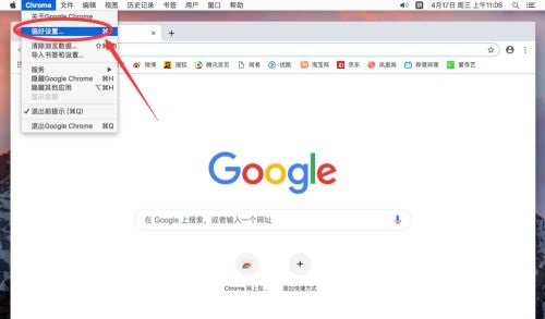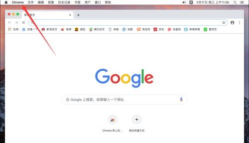 第四步:打开谷歌浏览器后,点击屏幕左上角苹果标志右侧的“Chrome”(如图所示)。