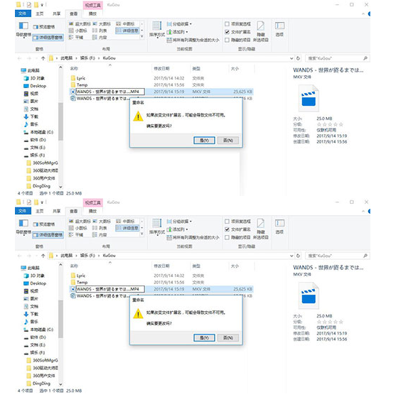 大家会发现mv是mkv格式的,那怎么转换成MP4格式呢?右键重命名它,然后直接重命名把后缀名mkv改成MP4格式,确定