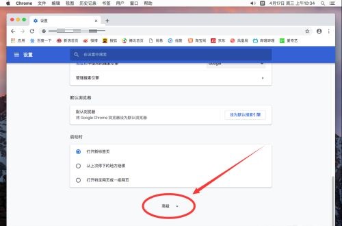 第四步:打开谷歌浏览器偏好设置后,向下滚动页面,点击最下面的“高级”(如图所示)。