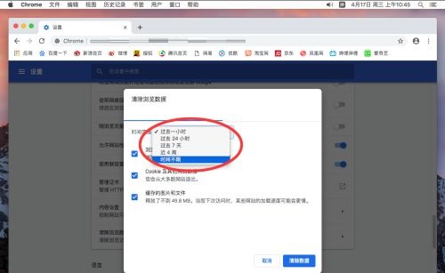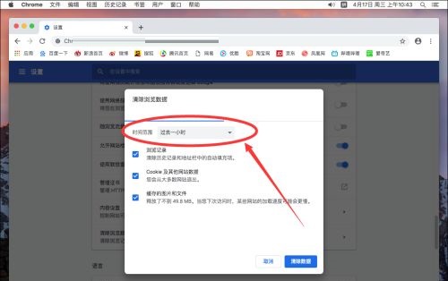 第六步:弹出清除浏览数据对话框,首先选择要清理的时间范围,默认显示的是“过去一小时”(如图所示)。