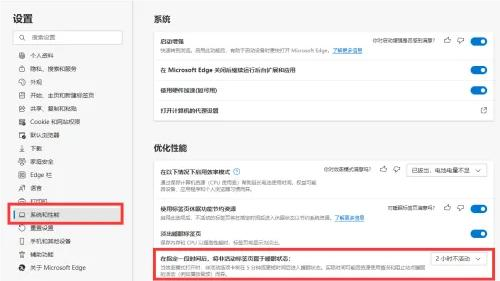 然后在设置界面点击“系统与性能”选项,选择非活动标签页置于睡眠状态的时间即可