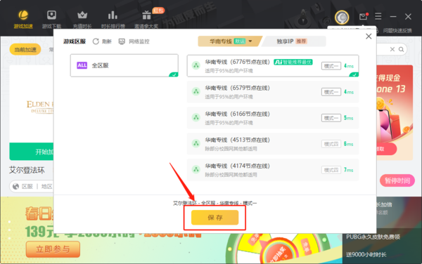 这时候会跳回到主界面,点击艾尔登法环下面的“开始加速”,在弹出的窗口中选择合适的节点,点击下方“保存”,这时候就可以开始给游戏加速了。