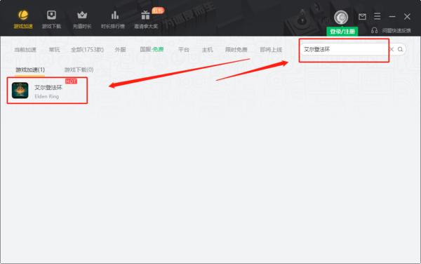 这里我们以雷神加速器为例,其它的加速器软件也同理哦。首先打开雷神加速器,在右上方的搜索框中输入“艾尔登法环”,这时下面会自动显示出我们所需要的游戏,或是按下回车键,也可以显示游戏图式,然后点击艾尔登法环。