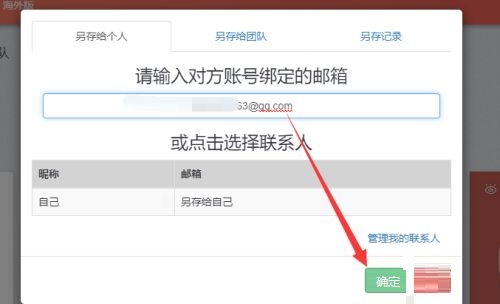 第四步:弹出的分享界面中选择另存给个人、团队等,输入相关信息后,点击底部确定即可(如图所示)。