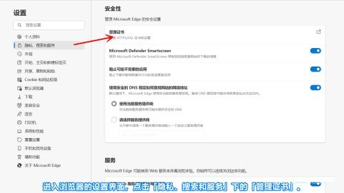 第一步:进入浏览器的设置界面,点击「隐私、搜索和服务」下的「管理证书」(如图所示)。