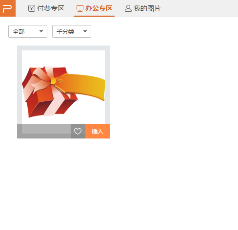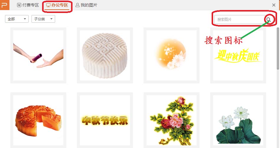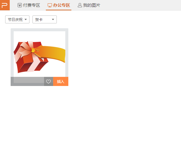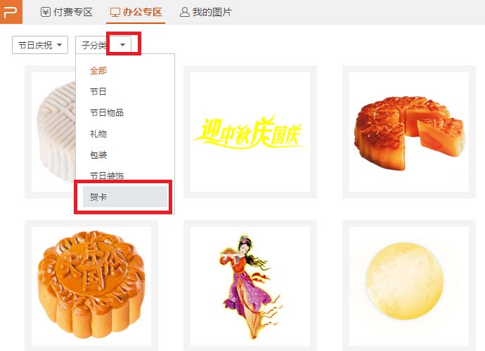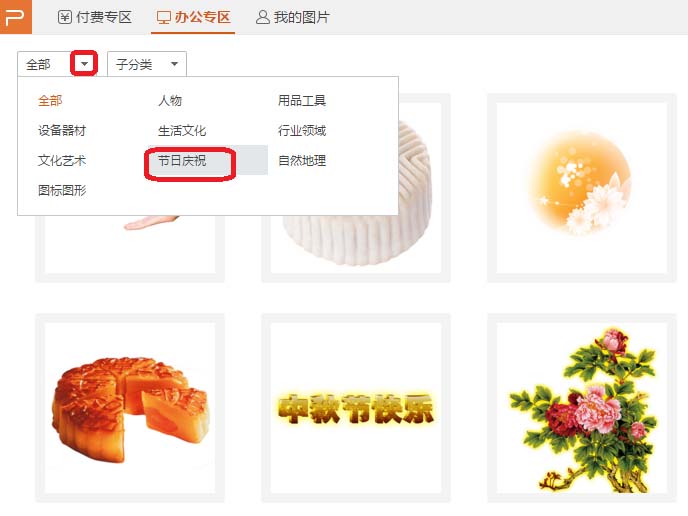 在弹出的在线图片选项卡中,点击“办公专区”,在左上角有可供选择图片的范围。点击“全部”右侧的小箭头,在弹出的范围中选择“节日庆祝”。