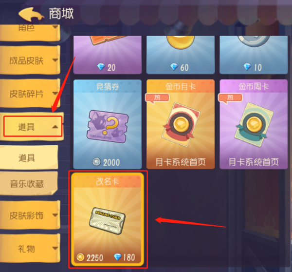 跳转到游戏商城页面后,在左侧下滑选择“道具”选项,之后在右侧道具显示框中,下滑找到“改名卡”选项。