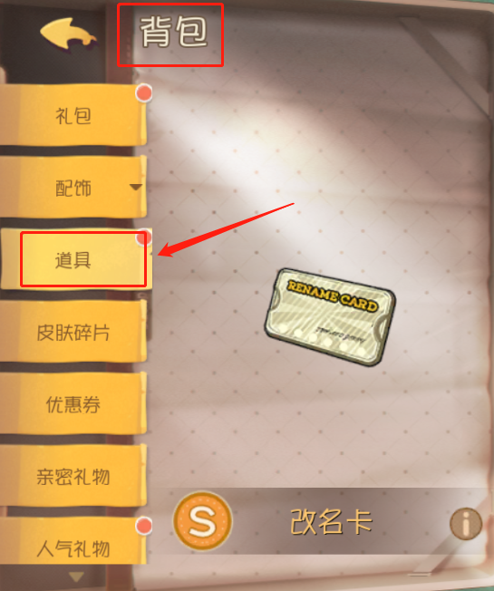购买完改名卡后,回到游戏主页面,点击右下角的“背包”图标。打开游戏背包后,在左侧选择“道具”选项。