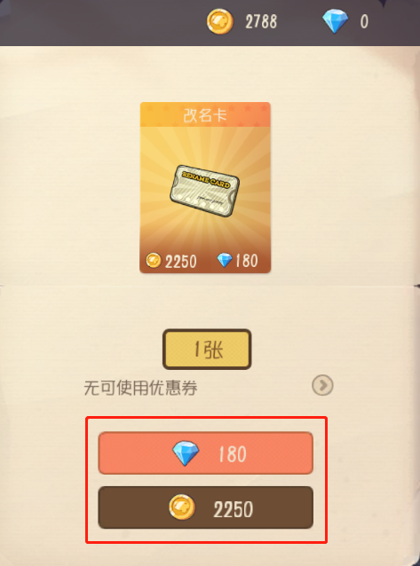 点击改名卡选项后,在右侧会弹出购买窗口,点击使用金币或者是钻石购买,只要符合要求就能马上获得了。