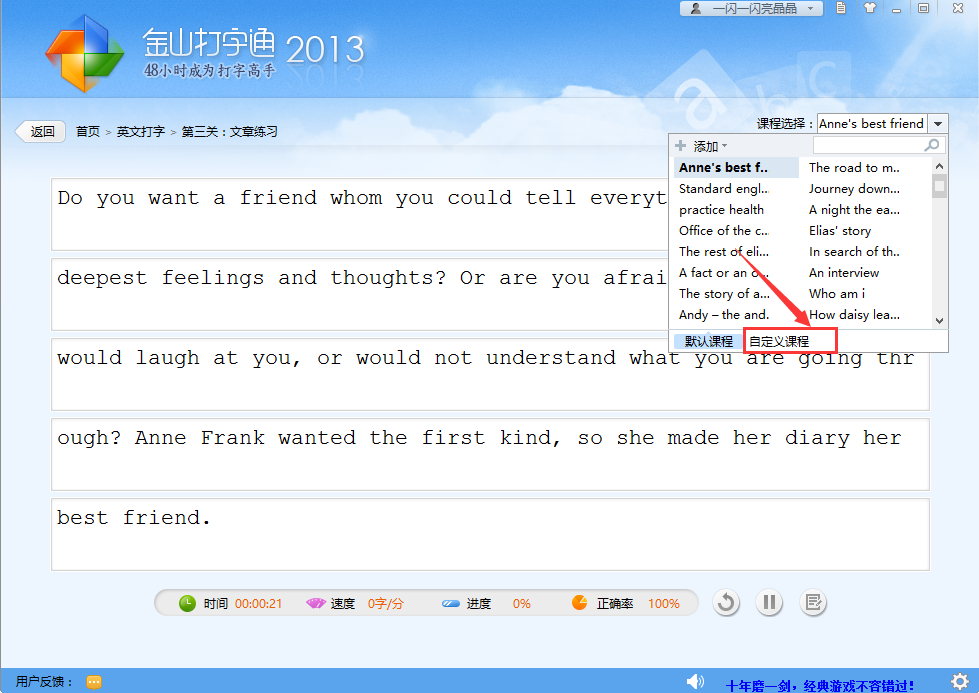 首先,打开金山打字通的英文打字—文章练习后,如图选择课程中,点击自定义课程。