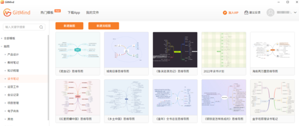Gitmind作为思维导图软件,更加适合我们去做“脑图型”的读书笔记,我们可以将书名作为脑图的中心主题,书中每个精彩的部分作为脑图的子主题,此外我们还可以利用联系和自由主题来实现对某一部分的批注。值得一提的是,即使我们没有做脑图的灵感,那我们还可以在Gitmind的模板中找到读书笔记模板,参照模板或者直接进行再创作也是不错的选择。