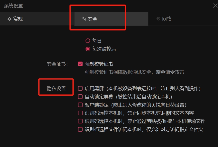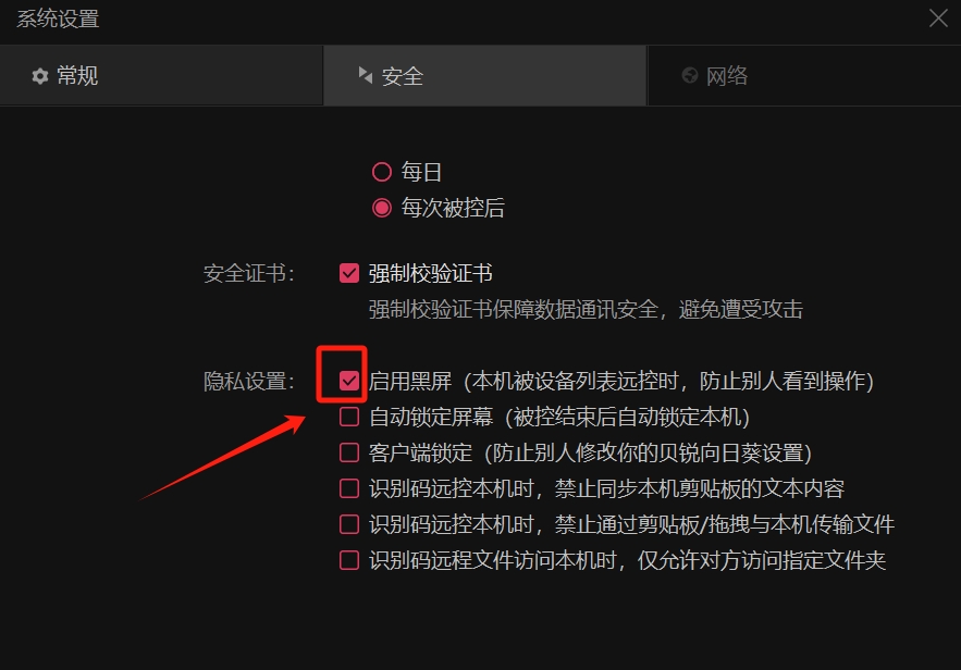 4、在“隐私设置”选项,勾选“启用黑屏(本机被远控时,防止别人看到操作)”前面的选框,即可立即应用生效。