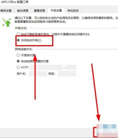 6. 进入升级设置界面后,找到“升级方式”栏,将其下“关闭自动升级”选项选中,点击“确定”就行。