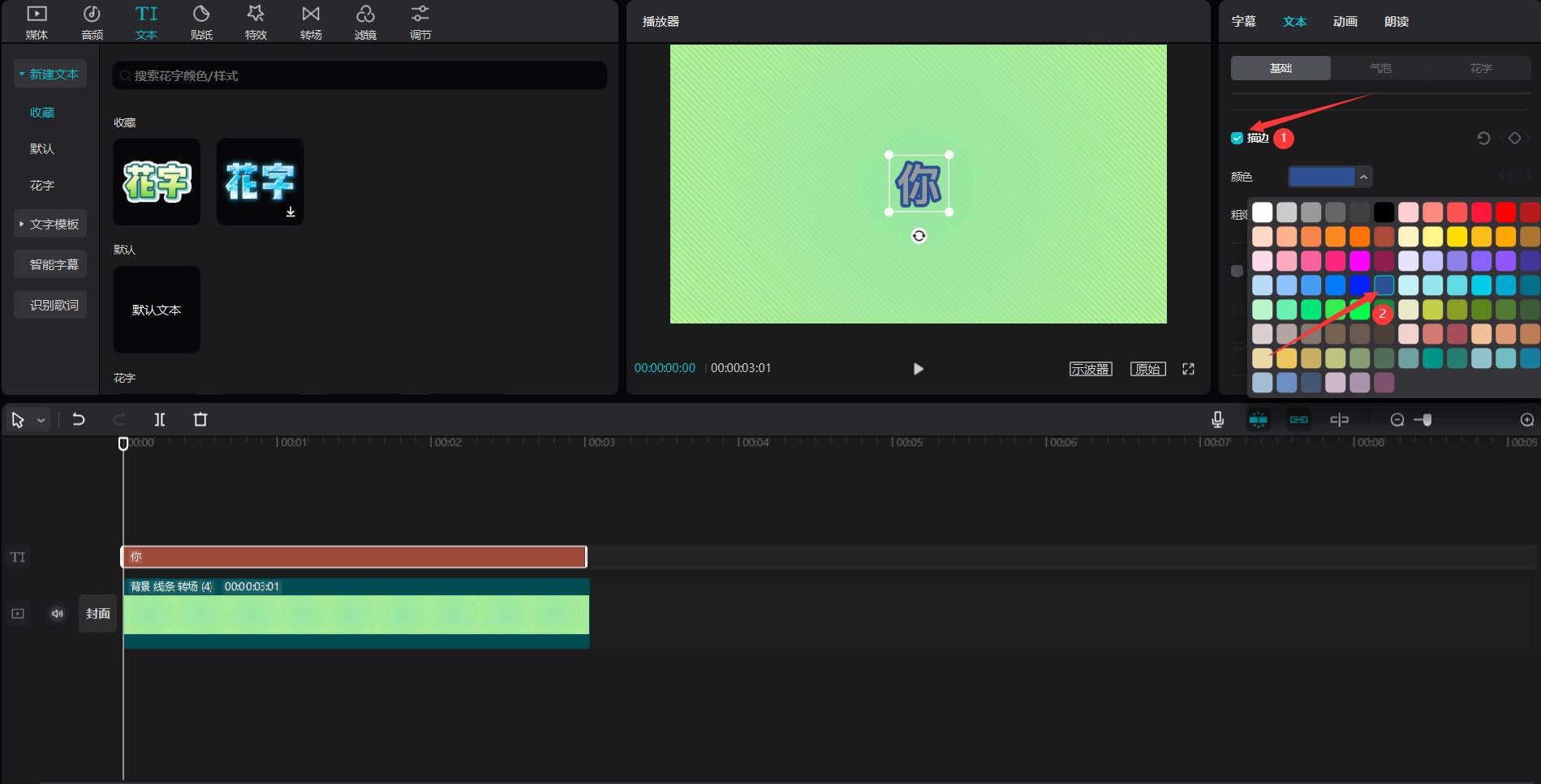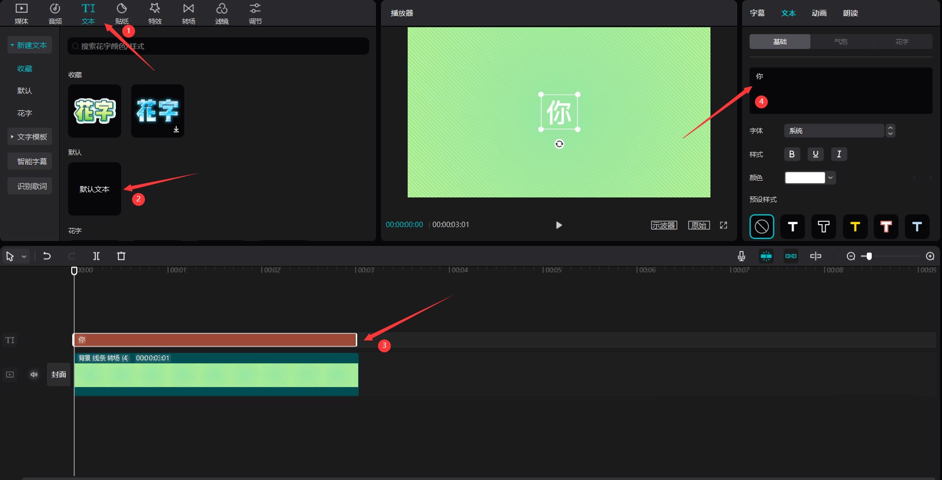 第二步:随后点击文字菜单,选择默认文本,将其添加到文字轨道上(如图所示)。