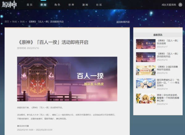 原神这款全新开放世界的RPG游戏目前已经开启了2.5版本的活动,而2.6版本的活动也即将要开始了,因为原神2.5版本活动目前已经接近尾声了。而就在近期,原神游戏的百人一揆活动也即将要开启了,那么肯定就有小伙伴们会问,那么原神游戏百人一揆活动的具体开始以及结束时间是什么时候呢?一起跟着财神爷站小编来看看吧。