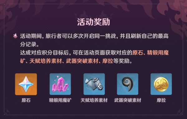 原神游戏百人一揆活动的奖励是,在活动期间,旅行者可以多次开启同一挑战,并且刷新自己的最高分记录。达成对应的积分目标后,便可以在活动页面领取对应的原石、摩拉、武器突破素材、天赋培养素材以及精锻用魔矿等奖励。