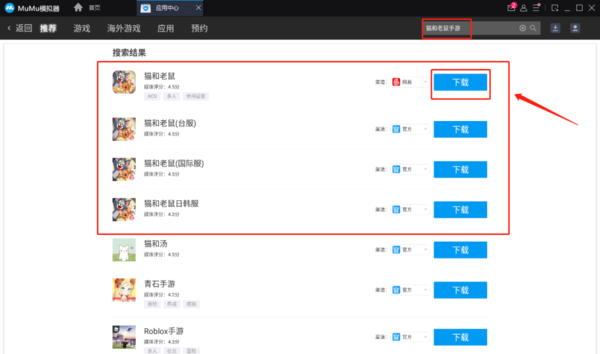 如果在电脑上已经安装有网易MuMu模拟器的,可以直接打开模拟器客户端,在搜索框搜索猫和老鼠手游。跳转到应用中心界面,并显示搜索结果之外,点击对应选项右侧的“下载”键,就能下载安装该游戏了。