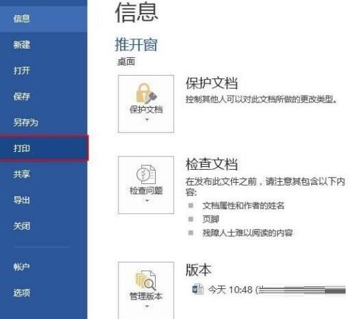 第一步:用Word 2013打开一篇文档,单击文档左上角的“文件”按钮,并在弹出的“文件”菜单中选择“打印”选项(如图所示)。