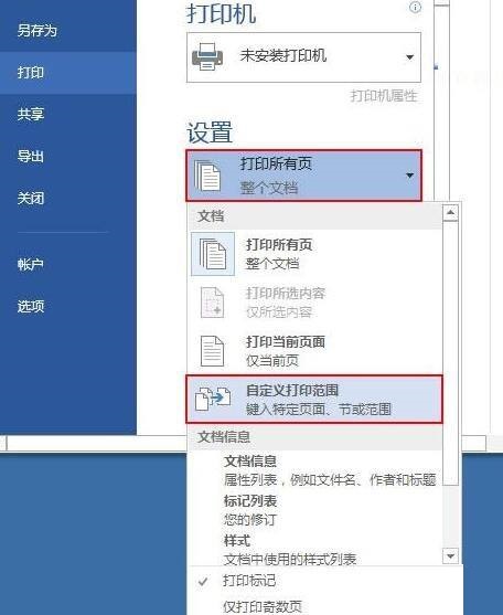 第二步:单击“设置”下方的选择框,选择“自定义打印范围”选项(如图所示)。