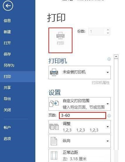 第三步:然后在“页数”右侧的文本框中输入我想要打印的页数,例如“3-60”,最后单击“打印”按钮即可(如图所示)。