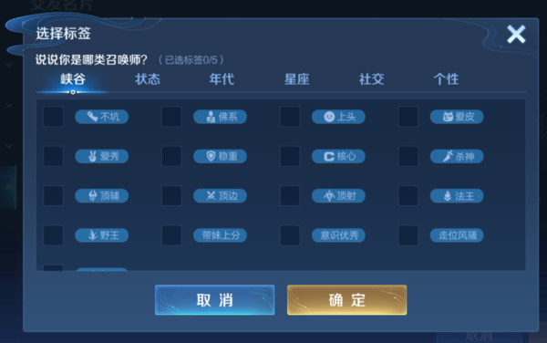 步骤五:点击左下角的标签字样,还能自定义设置个性标签,让其他玩家可以通过标签分类来查找添加为好友,不过当前玩家最多只可以选择五个标签。