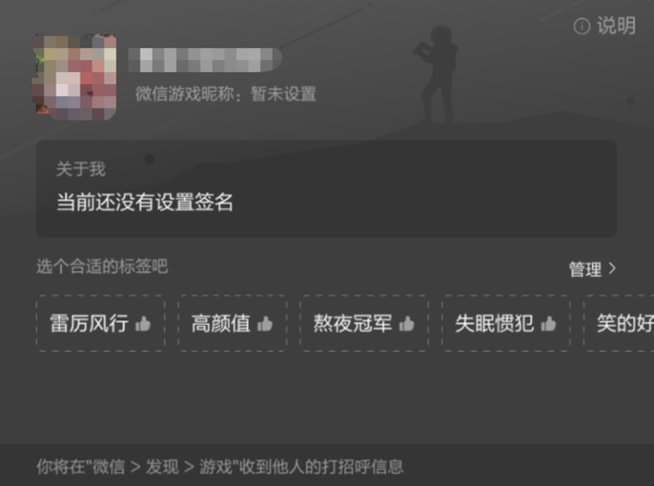 在弹出的微信名片窗口中,用户只能点选标签,不能进行内容头像编辑,想要更改的话,还需要在微信发现的游戏一栏进行编辑。